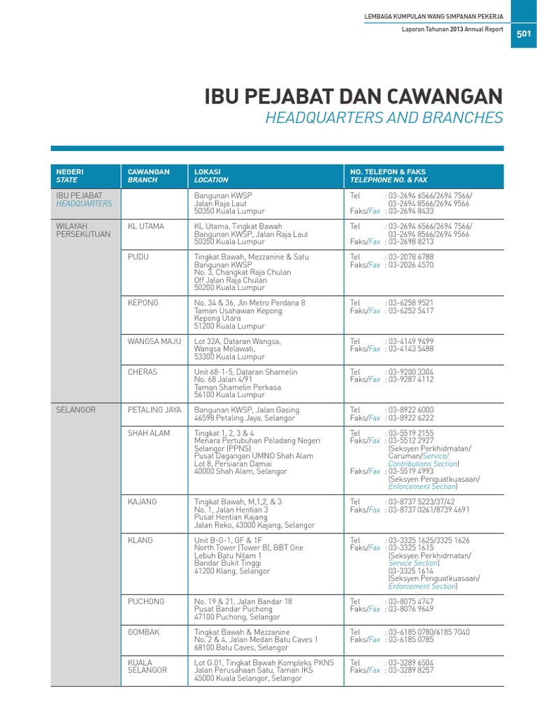 NEGERI CAWANGAN LOKASI NO. KWSP EPF Alor Setar Office. 03 8922 6222.